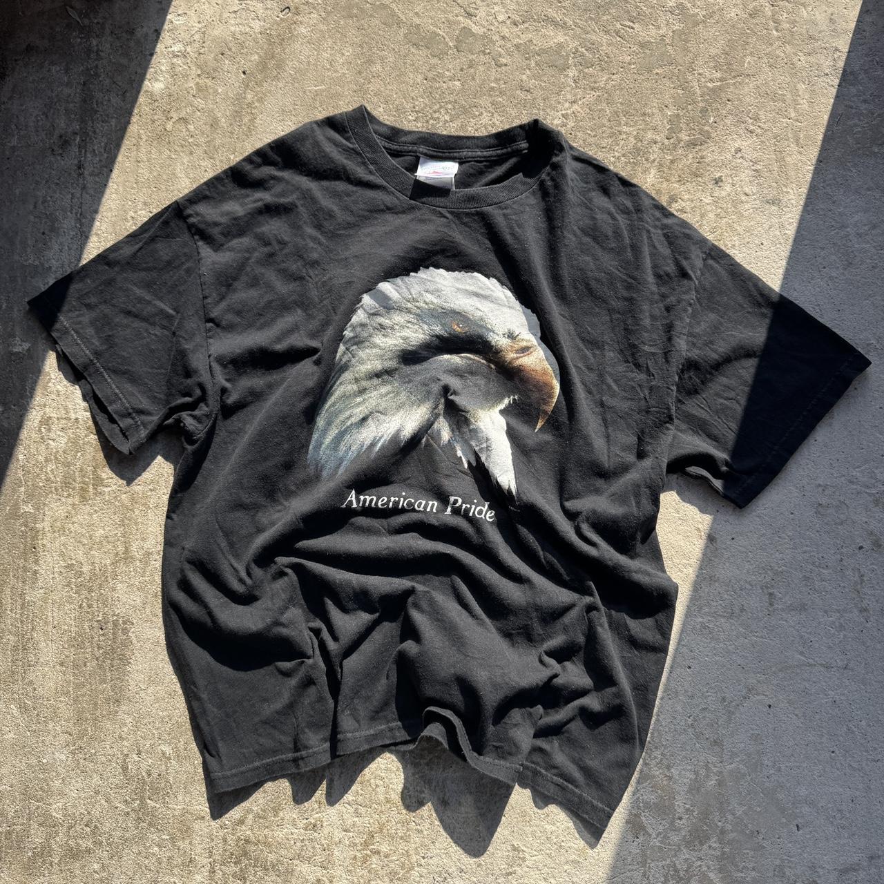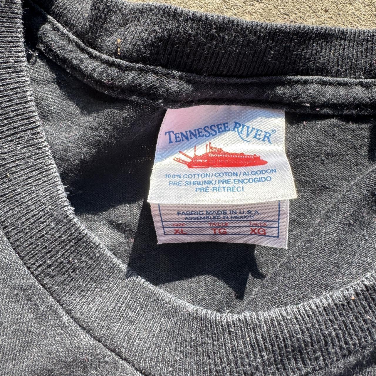 Vintage Tennessee River tee with a bold bald eagle front graphic and “American Pride” text. Faded black cotton with a soft feel and solid boxy fit. Classic USA heritage vibes – clean back, single stitch-style hem. Tagged XL – fits oversized. Light wear, no major flaws.